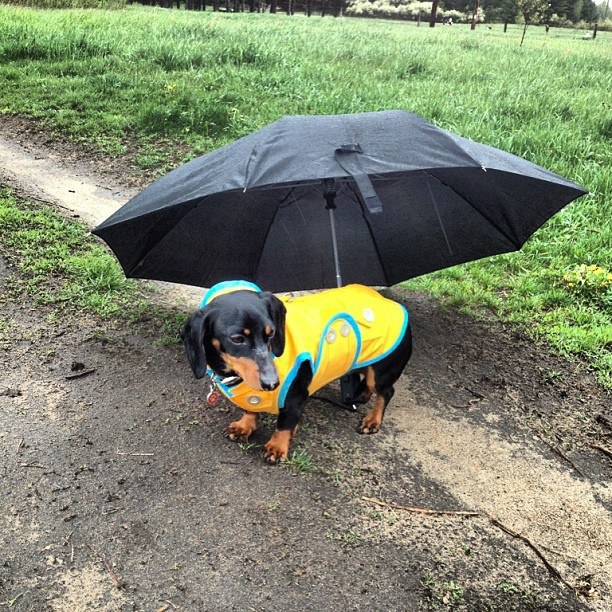 What is your doxie's attitude toward rain? Our Duke really didn't mind "doing his business" outside in the rain, but then, our house at the time had a large overhang, so he'd just stay under it and run back inside.